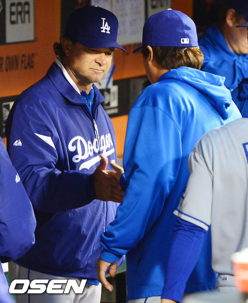 27일 (이하 한국시간) 미국 캘리포니아 샌프란시스코 AT&T 파크에서 열린 2013 메이저리그 샌프란시스코 자이언츠와 LA 다저스 경기, 덕아웃에서 돈 매팅리 감독이 류현진과 하이파이브를 하고 있다.