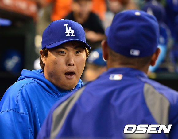 27일 (이하 한국시간) 미국 캘리포니아 샌프란시스코 AT&T 파크에서 열린 2013 메이저리그 샌프란시스코 자이언츠와 LA 다저스 경기, 덕아웃에서 류현진이 마몰과 즐겁게 장난을 치고 있다.