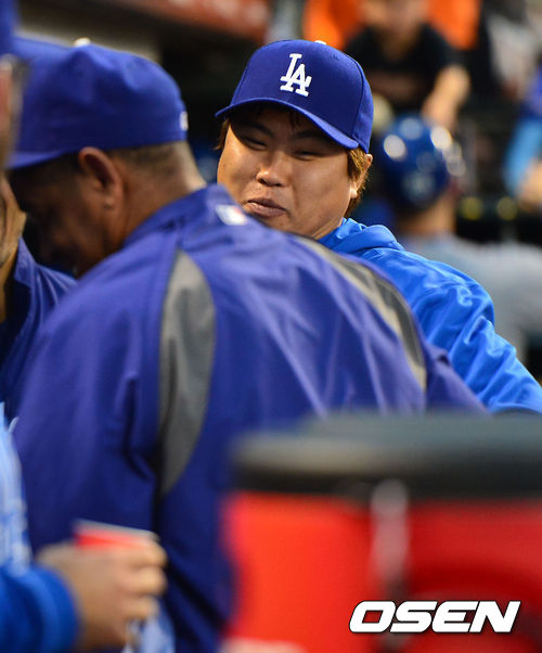 27일 (이하 한국시간) 미국 캘리포니아 샌프란시스코 AT&T 파크에서 열린 2013 메이저리그 샌프란시스코 자이언츠와 LA 다저스 경기, 덕아웃에서 류현진이 마몰과 즐겁게 장난을 치고 있다.
