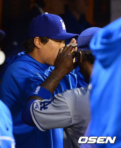 27일 (이하 한국시간) 미국 캘리포니아 샌프란시스코 AT&T 파크에서 열린 2013 메이저리그 샌프란시스코 자이언츠와 LA 다저스 경기, 덕아웃에서 류현진이 핸리 라미레스와 아이씨유 세레모니를 하고 있다.