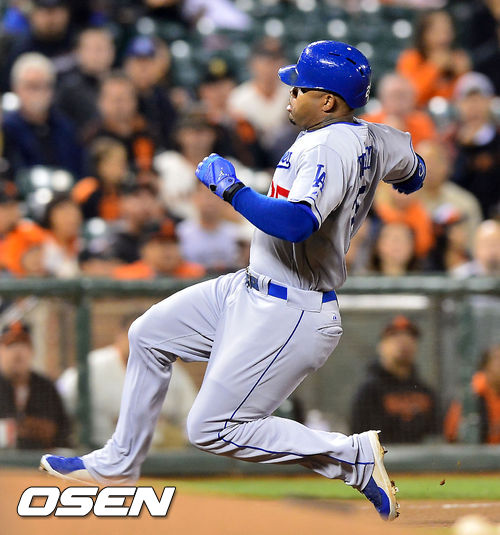 27일 (이하 한국시간) 미국 캘리포니아 샌프란시스코 AT&T 파크에서 열린 2013 메이저리그 샌프란시스코 자이언츠와 LA 다저스 경기, 1회초 1사 다저스 칼 크로포드가 3루타를 날리고 3루로 몸을 날리고 있다.