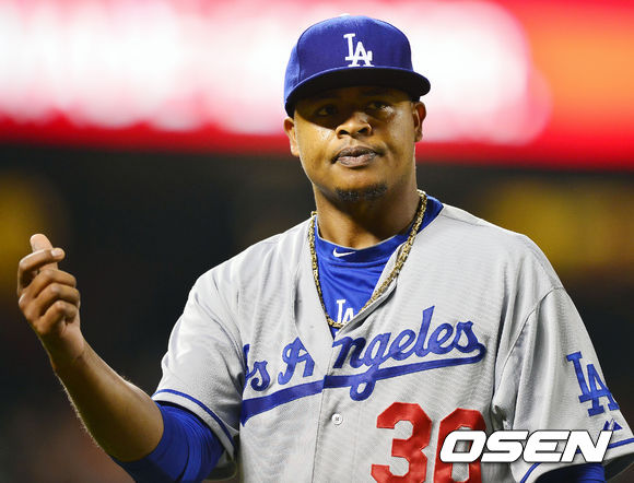 27일 (이하 한국시간) 미국 캘리포니아 샌프란시스코 AT&T 파크에서 열린 2013 메이저리그 샌프란시스코 자이언츠와 LA 다저스 경기, 1회를 마친 다저스 볼케스가 제스쳐를 취하며 덕아웃으로 향하고 있다.
