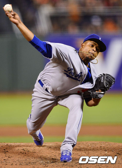 27일 (이하 한국시간) 미국 캘리포니아 샌프란시스코 AT&T 파크에서 열린 2013 메이저리그 샌프란시스코 자이언츠와 LA 다저스 경기, 다저스 선발 에디슨 볼케스가 힘차게 공을 뿌리고 있다.