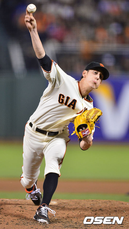 27일 (이하 한국시간) 미국 캘리포니아 샌프란시스코 AT&T 파크에서 열린 2013 메이저리그 샌프란시스코 자이언츠와 LA 다저스 경기, 샌프란시스코 선발 팀 린스컴이 힘차게 공을 뿌리고 있다.