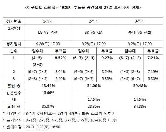 [야구토토] 국민체육진흥공단(www.kspo.or.kr)이 발행하는 체육진흥투표권 수탁사업자인 스포츠토토의 공식 온라인 발매 사이트 베트맨(www.betman.co.kr)이 오는 28일에 열리는 한국프로야구(KBO) 3경기를 대상으로 한 야구토토 스페셜+ 49회차 투표율을 중간 집계한 결과, 야구팬의 48.44%는 LG-넥센(1경기)전에서 홈팀 LG가 넥센에 우세한 경기를 펼칠 것으로 내다봤다.