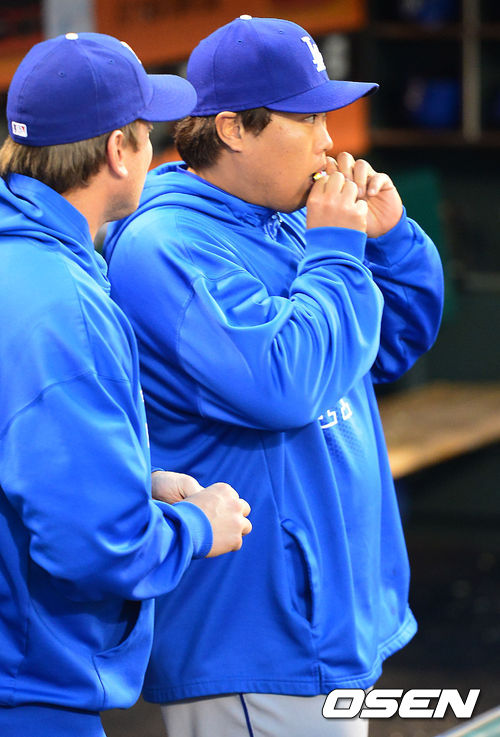 27일 (이하 한국시간) 미국 캘리포니아 샌프란시스코 AT&T 파크에서 열린 2013 메이저리그 샌프란시스코 자이언츠와 LA 다저스 경기, 류현진이 덕아웃에서 간식을 먹고 있다.