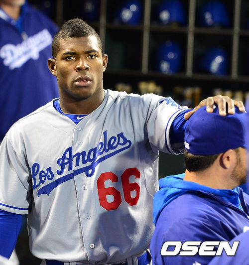 27일 (이하 한국시간) 미국 캘리포니아 샌프란시스코 AT&T 파크에서 열린 2013 메이저리그 샌프란시스코 자이언츠와 LA 다저스 경기, 덕아웃에서 다저스 야시엘 푸이그가 어제 패전 투수가 된 놀라스코의 머리를 쓰다듬고 있다.