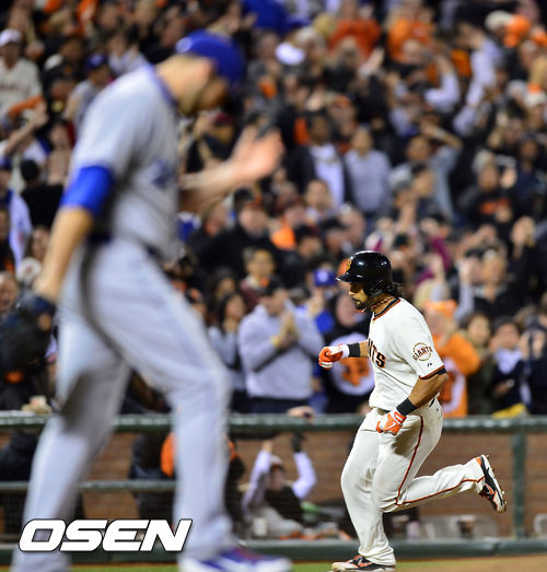 27일 (이하 한국시간) 미국 캘리포니아 샌프란시스코 AT&T 파크에서 열린 2013 메이저리그 샌프란시스코 자이언츠와 LA 다저스 경기, 8회말 선두타자 앙헬 파간이 좌월 솔로 홈런을 날린 후 그라운드를 돌고 있다.