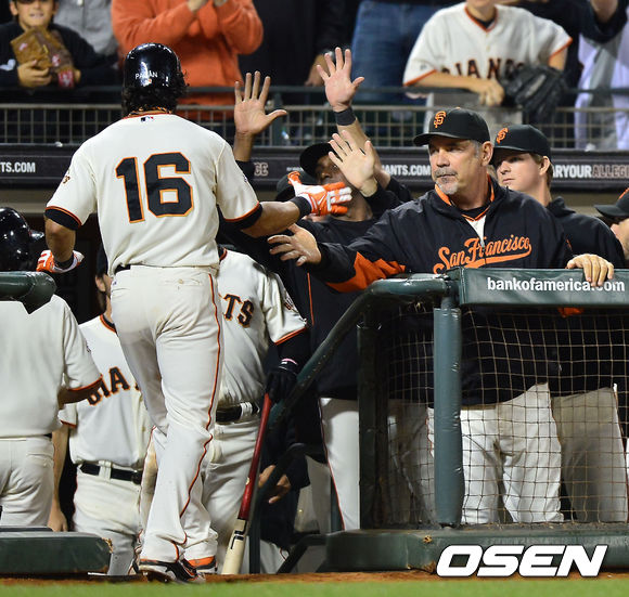 27일 (이하 한국시간) 미국 캘리포니아 샌프란시스코 AT&T 파크에서 열린 2013 메이저리그 샌프란시스코 자이언츠와 LA 다저스 경기, 8회말 선두타자 앙헬 파간이 좌월 역전 솔로 홈런을 날린 후 덕아웃에서 브루스 보치 감독과 하이파이브를 하고 있다.