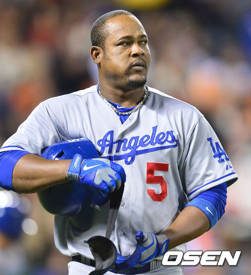 27일 (이하 한국시간) 미국 캘리포니아 샌프란시스코 AT&T 파크에서 열린 2013 메이저리그 샌프란시스코 자이언츠와 LA 다저스 경기, 8회초 2사 다저스 후안 유리베가 날린 타구가 3루수 라인드라이브로 아웃 되자 유리베가 아쉬워하고 있다.