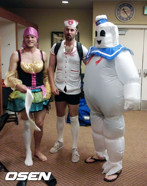 마시멜로맨 코스튬 복장은 내부에 선풍기가 장착돼 몸을 크게 부풀릴 수 있다. 류현진은 뒤뚱거리며 라커룸을 돌아다니며 동료들의 폭소를 이끌어냈다.