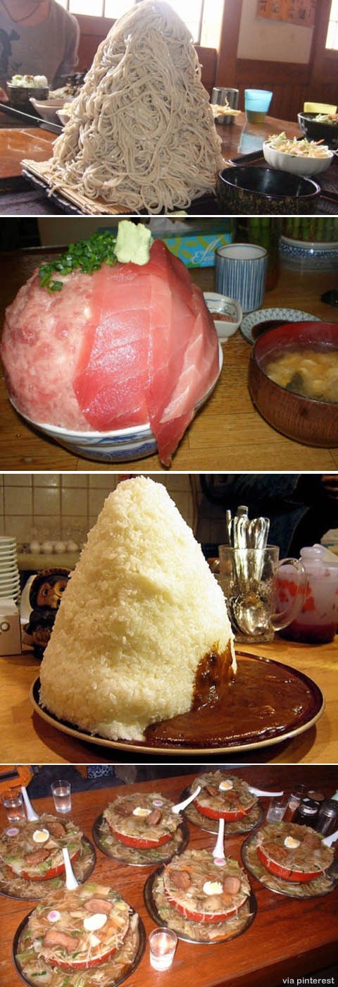 보통 특대형 음식이라 하면 식탁만한 피자나 피자만한 햄버거 등 서양 음식들이 대부분이었으나, 최근 화제가 되고 있는 사진은 돈까스, 모밀면, 일본식 라면 등 일본 음식들이 주를 이루고 있다는 것이 특이하다.
