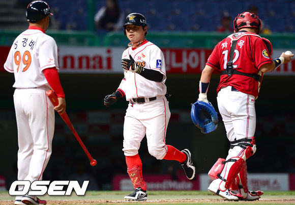 27일 오후 인천 문학구장에서 열린 '2013 한국야쿠르트 세븐 프로야구' SK 와이번스와 KIA 타이거즈의 경기, 1회말 SK 박재상이 선취 솔로홈런을 날린후 정경배 코치와 하이파이브를 하고 있다