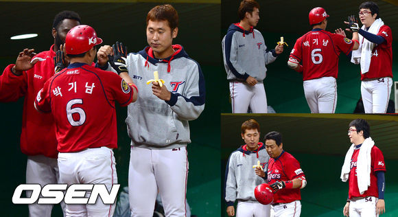 27일 오후 인천 문학구장에서 열린 '2013 한국야쿠르트 세븐 프로야구' SK 와이번스와 KIA 타이거즈의 경기, 7회초 KIA 윤석민이 동점 솔로홈런을 날린 박기남에게 먹던 바나나를 내밀려 축하하고 있다.