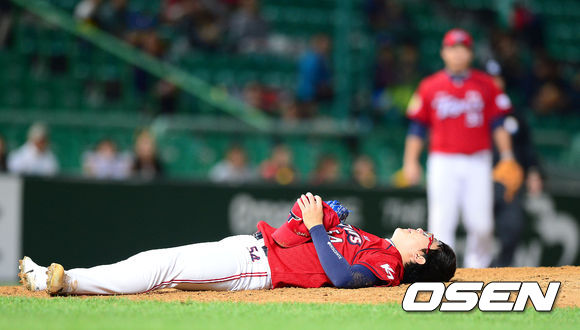 27일 오후 인천 문학구장에서 열린 '2013 한국야쿠르트 세븐 프로야구' SK 와이번스와 KIA 타이거즈의 경기, 8회말 2사 KIA 양현종 선발투수가 SK 최정의 강습타구를 피하며 쓰러져 있다.