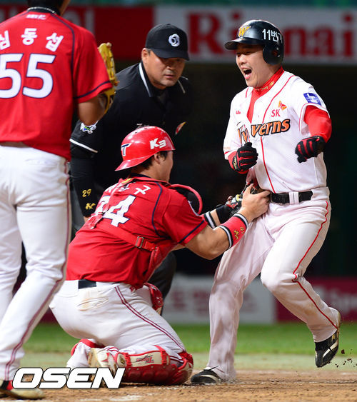 27일 오후 인천 문학구장에서 열린 '2013 한국야쿠르트 세븐 프로야구' SK 와이번스와 KIA 타이거즈의 경기,9회말 2사 만루 SK 박재상의 타석의 KIA 김동섭 투수의 폭투때 홈으로 쇄도하던 3루 주자 정근우가 태그아웃되고 있다.