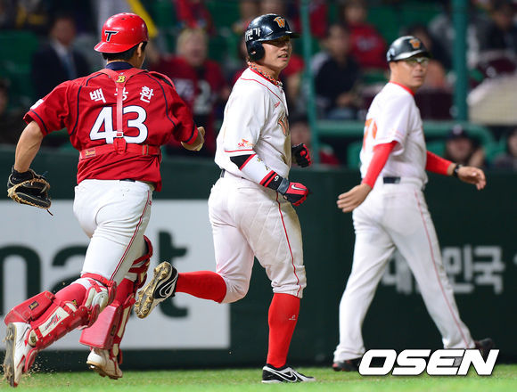 27일 오후 인천 문학구장에서 열린 '2013 한국야쿠르트 세븐 프로야구' SK 와이번스와 KIA 타이거즈의 경기,연장 10회말 1사 2,3루 SK 한동민의 내야땅볼때 3루 주자 박재상이 협살에 걸려 태그아웃되고 있다.