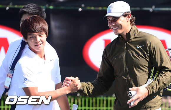 27일 오후 서울 광진구 쉐라톤 워커힐 호텔 테니스장에서 열린 라파엘 나달 방한 행사에서 나달이 이덕희와 인사를 나누고 있다