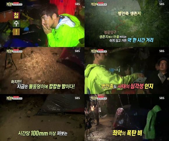 27일 오후 방송된 SBS 예능프로그램 '정글의 법칙'에서는 갑작스러운 폭우에 긴급철수가 결정되는 병만족의 모습이 전파를 탔다.