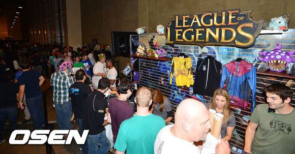 28일 (이하 한국시간) 미국 캘리포니아 로스앤젤레스의 갈렌 센터에서 'LOL 시즌3 월드챔피언십(이하 롤드컵)' 4강전 한국팀 SK텔레콤 T1과 나진 블랙 소드의 경기에서 수많은 팬들이 입장을 하며 팬샵의 물품을 사고 있다.