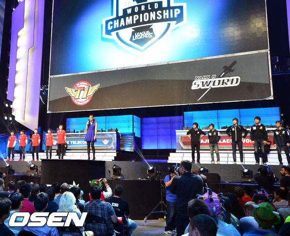 28일 (이하 한국시간) 미국 캘리포니아 로스앤젤레스의 갈렌 센터에서 'LOL 시즌3 월드챔피언십(이하 롤드컵)' 4강전 한국팀 SK텔레콤 T1과 나진 블랙 소드의 경기에서 양팀 선수들이 포즈를 취하고 있다.