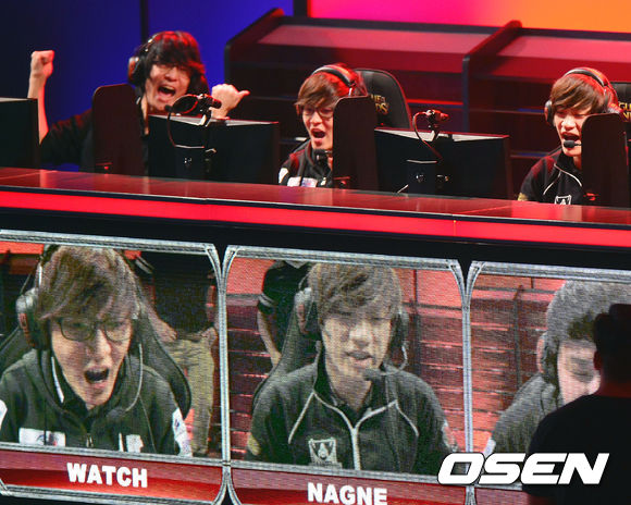 28일 (이하 한국시간) 미국 캘리포니아 로스앤젤레스의 갈렌 센터에서 열린 'LOL 시즌3 월드챔피언십(이하 롤드컵)' 4강전 한국팀 SK텔레콤 T1과 나진 블랙 소드의 경기에서 1세트를 먼저 따낸 나진 소드가 기뻐하고 있다.