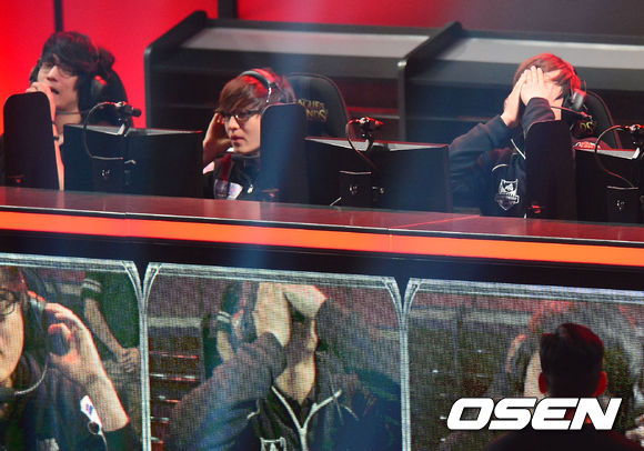 28일 (이하 한국시간) 미국 캘리포니아 로스앤젤레스의 갈렌 센터에서 열린 'LOL 시즌3 월드챔피언십(이하 롤드컵)' 4강전 한국팀 SK텔레콤 T1과 나진 블랙 소드의 경기에서 1세트를 먼저 따낸 나진 소드가 기뻐하고 있다.