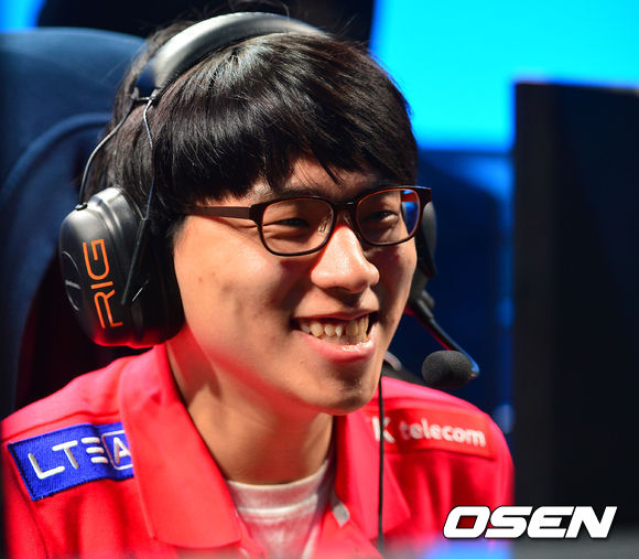 28일 (이하 한국시간) 미국 캘리포니아 로스앤젤레스의 갈렌 센터에서 열린 'LOL 시즌3 월드챔피언십(이하 롤드컵)' 4강전 한국팀 SK텔레콤 T1과 나진 블랙 소드의 경기에서 SKT 뱅기 배성웅이 게임을 플레이하며 미소짓고 있다.