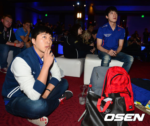 28일 (이하 한국시간) 미국 캘리포니아 로스앤젤레스의 갈렌 센터에서 열린 'LOL 시즌3 월드챔피언십(이하 롤드컵)' 4강전 한국팀 SK텔레콤 T1과 나진 블랙 소드의 경기에서 SKT 최병훈 코치 김정균 코치가 경기를 지켜보고 있다.