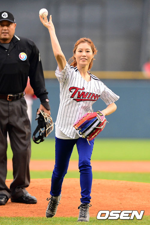 28일 오후 서울 잠실구장에서 열린 '2013 한국야쿠르트 세븐 프로야구' LG 트윈스와 넥센 히어로즈의 경기 시작전 문소리가 시구를 하고 있다.