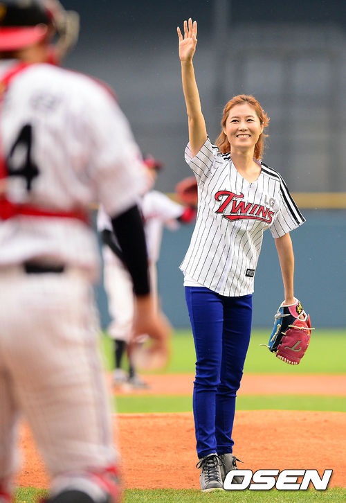 28일 오후 서울 잠실구장에서 열린 '2013 한국야쿠르트 세븐 프로야구' LG 트윈스와 넥센 히어로즈의 경기 시작전 시구자로 나선 문소리가 관중들에게 인사를 하고 있다.