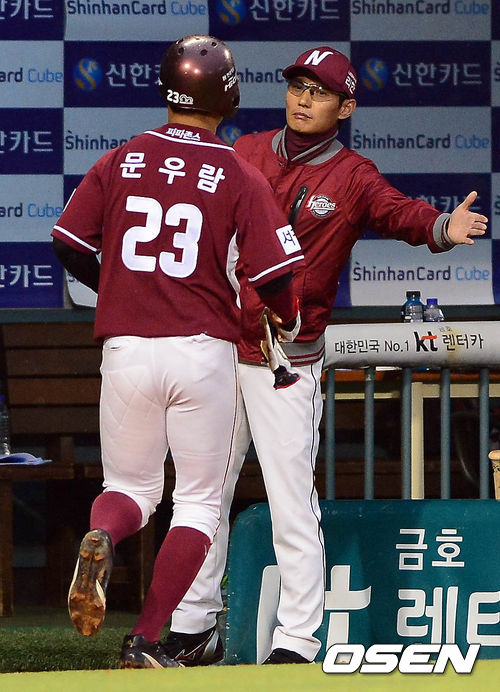 28일 오후 서울 잠실구장에서 열린 '2013 한국야쿠르트 세븐 프로야구' LG 트윈스와 넥센 히어로즈의 경기 4회초 무사 만루 김민성의 희생플라이에 홈을 밟은 3루주자 문우람이 염경엽 감독과 하이파이브를 하고 있다.