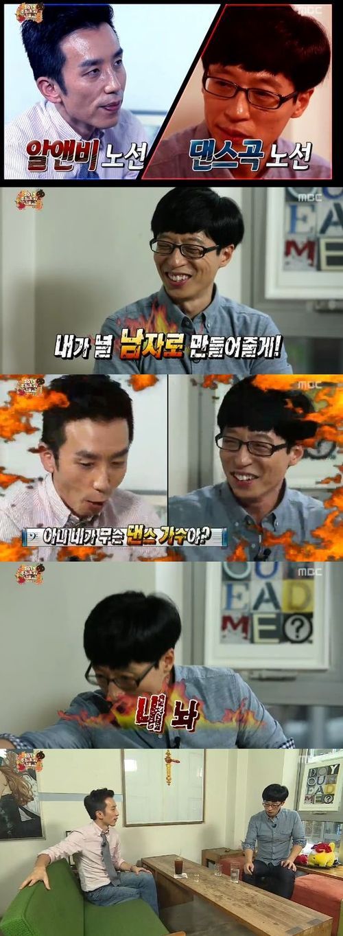 그러나 유재석의 생각은 달랐다. 그는 "난 신나고 싶다. 신나지 않으면 미치겠다"며 평소 그가 애창하던 댄스 장르를 하자고 주장했다. 유희열고 지지 않고 "이번에 깨보자. 내가 널 남자로 만들어 주겠다"면서 알앤비 장르를 제안했다.