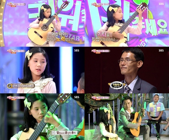 28일 오후 방송된 SBS 예능프로그램 '놀라운 대회 스타킹'에는 13살의 어린 나이에 전국 기타콩쿠르에서 2연승을 차지한 천재 기타소녀 이하늘 양이 출연했다.