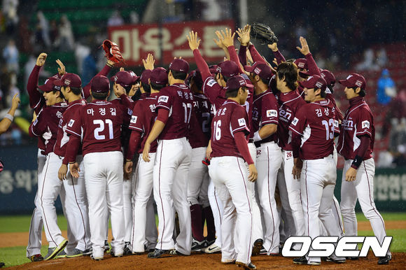 28일 오후 서울 잠실구장에서 열린 '2013 한국야쿠르트 세븐 프로야구' LG 트윈스와 넥센 히어로즈의 경기 종료 후 넥센 선수들이 포스트시즌 진출 확정을 기뻐하고 있다.