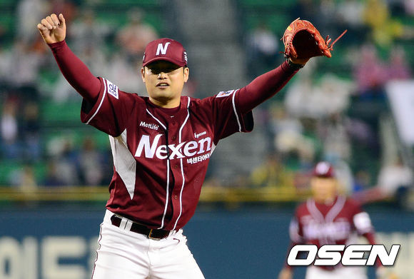 28일 오후 서울 잠실구장에서 열린 '2013 한국야쿠르트 세븐 프로야구' LG 트윈스와 넥센 히어로즈의 경기 8회말 2사 1,2루 박용택을 삼진으로 처리한 손승락이 환호하고 있다.