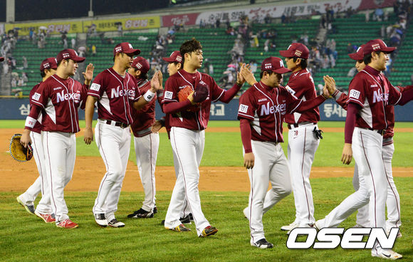 28일 오후 서울 잠실구장에서 열린 '2013 한국야쿠르트 세븐 프로야구' LG 트윈스와 넥센 히어로즈의 경기 종료 후 넥센 선수들이 하이파이브를 하며 그라운드를 빠져나가고 있다.