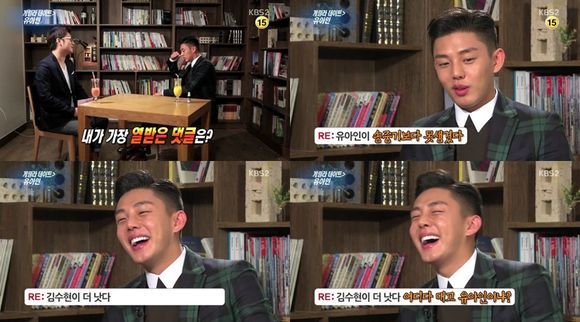 또한 "'김수현이 낫다'라는 댓글과 '어디다 대고 유아인이냐'라는 댓글"이라고 덧붙여 현장을 웃음바다로 만들었다.