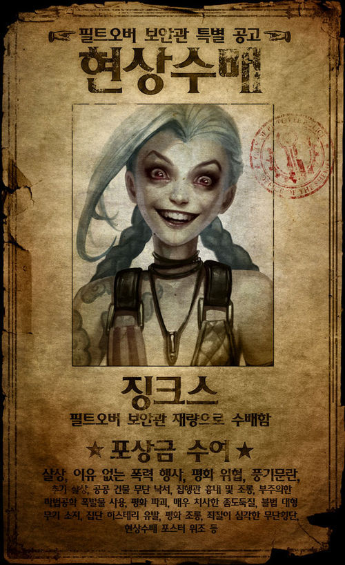 장난기 많으면서도 섬뜩한 표정의 소유자 ‘징크스’는 롤의 116번째 신규 챔피언이며 롤 스토리상 행정 구역 중 하나인 ‘필트오버’를 혼란으로 빠뜨린 인물로 현상 수배가 내려졌다.