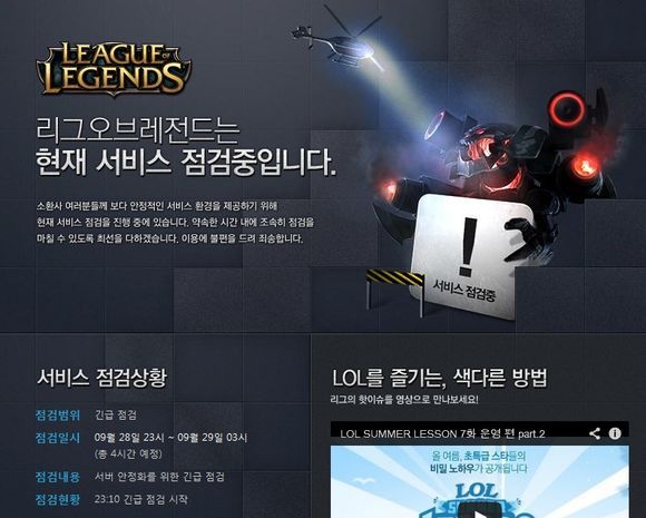 28일 라이엇게임즈는 ‘리그 오브 레전드(이하 롤)’ 공식 홈페이지서 9시 23분을 기점으로 롤서버가 정상화 됐음을 공지했다가 11시부터 다시 점검에 들어갔다. 같은 날에만 3번째 진행되는 서비스 점검은 29일 새벽 3시까지 총 4시간 동안 이뤄질 예정이다.