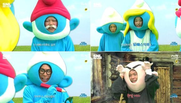 ‘개구쟁이 스덕후’에서는 'SNL코리아' 고정크루 이상훈, 정성호, 정명옥 등이 주인공으로 활약했다. 이들은 스머프 마을에 살고 있는 투덜이, 똑똑이, 바빠스덕후, 레이디가가맨으로 분해 개성 넘치는 모습을 보였다.