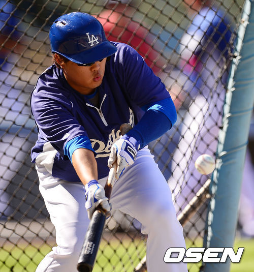 29일 (이하 한국시간) 미국 캘리포니아주 로스앤젤레스 다저스타디움에서 열린 2013 메이저리그 LA 다저스와 콜로라도 로키스의 경기가 열릴 예정인 가운데 경기 전 훈련시간에 다저스 류현진이 번트연습을 하고 있다.