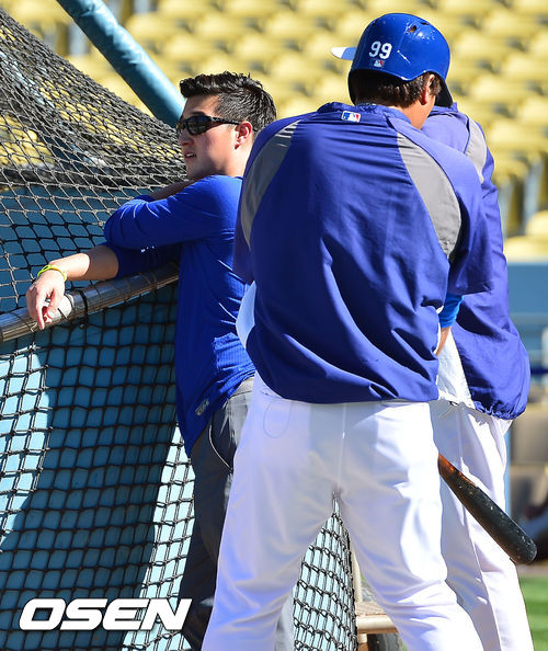 29일 (이하 한국시간) 미국 캘리포니아주 로스앤젤레스 다저스타디움에서 열린 2013 메이저리그 LA 다저스와 콜로라도 로키스의 경기가 열릴 예정인 가운데 경기 전 훈련시간에 다저스 류현진이 마틴김의 엉덩이를 배트로 살짝 치고 있다.