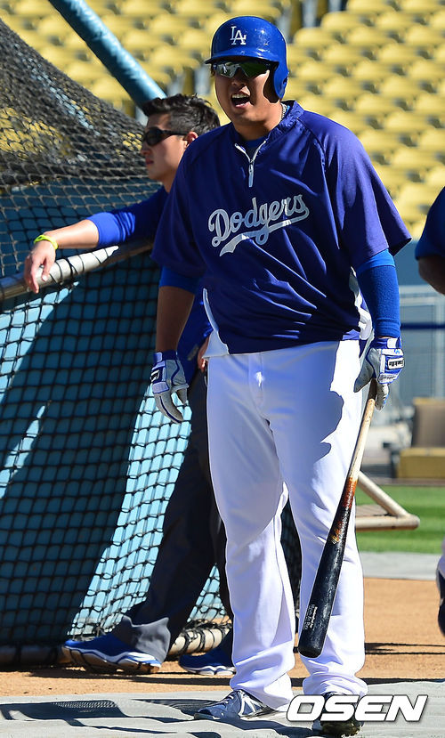 29일 (이하 한국시간) 미국 캘리포니아주 로스앤젤레스 다저스타디움에서 열린 2013 메이저리그 LA 다저스와 콜로라도 로키스의 경기가 열릴 예정인 가운데 경기 전 훈련시간에 다저스 류현진이 타격연습을 기다리며 타구를 바라보고 있다.