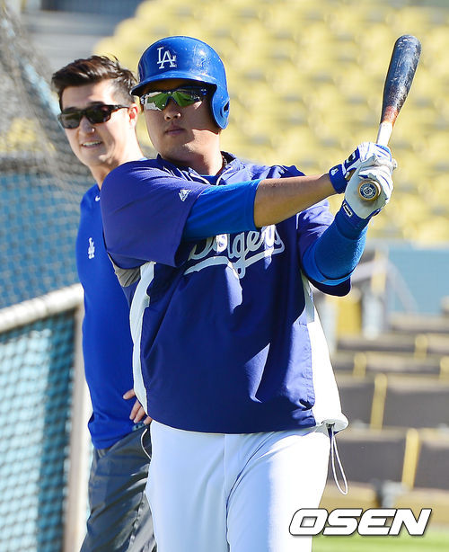 29일 (이하 한국시간) 미국 캘리포니아주 로스앤젤레스 다저스타디움에서 열린 2013 메이저리그 LA 다저스와 콜로라도 로키스의 경기가 열릴 예정인 가운데 경기 전 훈련시간에 다저스 류현진이 스윙 연습하는 모습을 마틴김이 미소지으며 바라보고 있다.