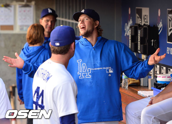 29일 (이하 한국시간) 미국 캘리포니아주 로스앤젤레스 다저스타디움에서 열린 2013 메이저리그 LA 다저스와 콜로라도 로키스의 경기, 다저스 덕아웃에서 클레이튼 커쇼가 노래를 흥얼거리고 있다.