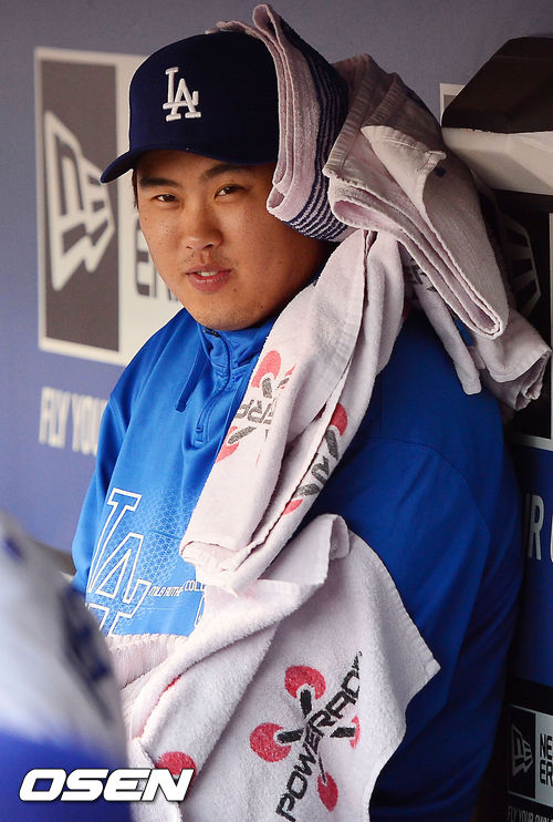 29일 (이하 한국시간) 미국 캘리포니아주 로스앤젤레스 다저스타디움에서 열린 2013 메이저리그 LA 다저스와 콜로라도 로키스의 경기, 다저스 덕아웃에서 류현진이 후안 유리베의 수건 공격에 당한 후 미소짓고 있다.
