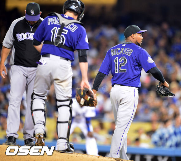 29일 (이하 한국시간) 미국 캘리포니아주 로스앤젤레스 다저스타디움에서 열린 2013 메이저리그 LA 다저스와 콜로라도 로키스의 경기, 6회말 1사 주자 1,3루 콜로라도 선발 후안 니카시오가 교체되고 있다.