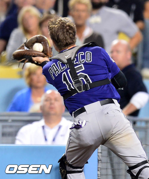 29일 (이하 한국시간) 미국 캘리포니아주 로스앤젤레스 다저스타디움에서 열린 2013 메이저리그 LA 다저스와 콜로라도 로키스의 경기, 6회말 1사 주자 만루 다저스 후안 유리베의 타구를 포수 조단 파체코가 잡아내고 있다.