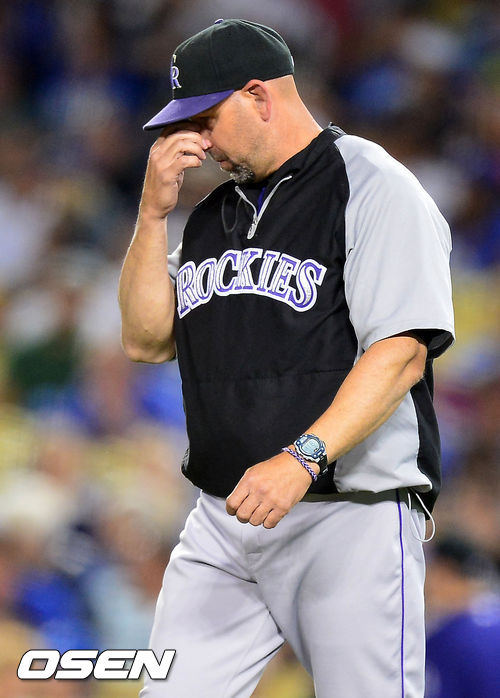 29일 (이하 한국시간) 미국 캘리포니아주 로스앤젤레스 다저스타디움에서 열린 2013 메이저리그 LA 다저스와 콜로라도 로키스의 경기, 6회말 1사 주자 만루 다저스 유리베 타석에서 콜로라도 투수 아웃맨을 교체시키기 위해 콜로라도의 월트 와이스 감독이 마운드에 오르고 있다.